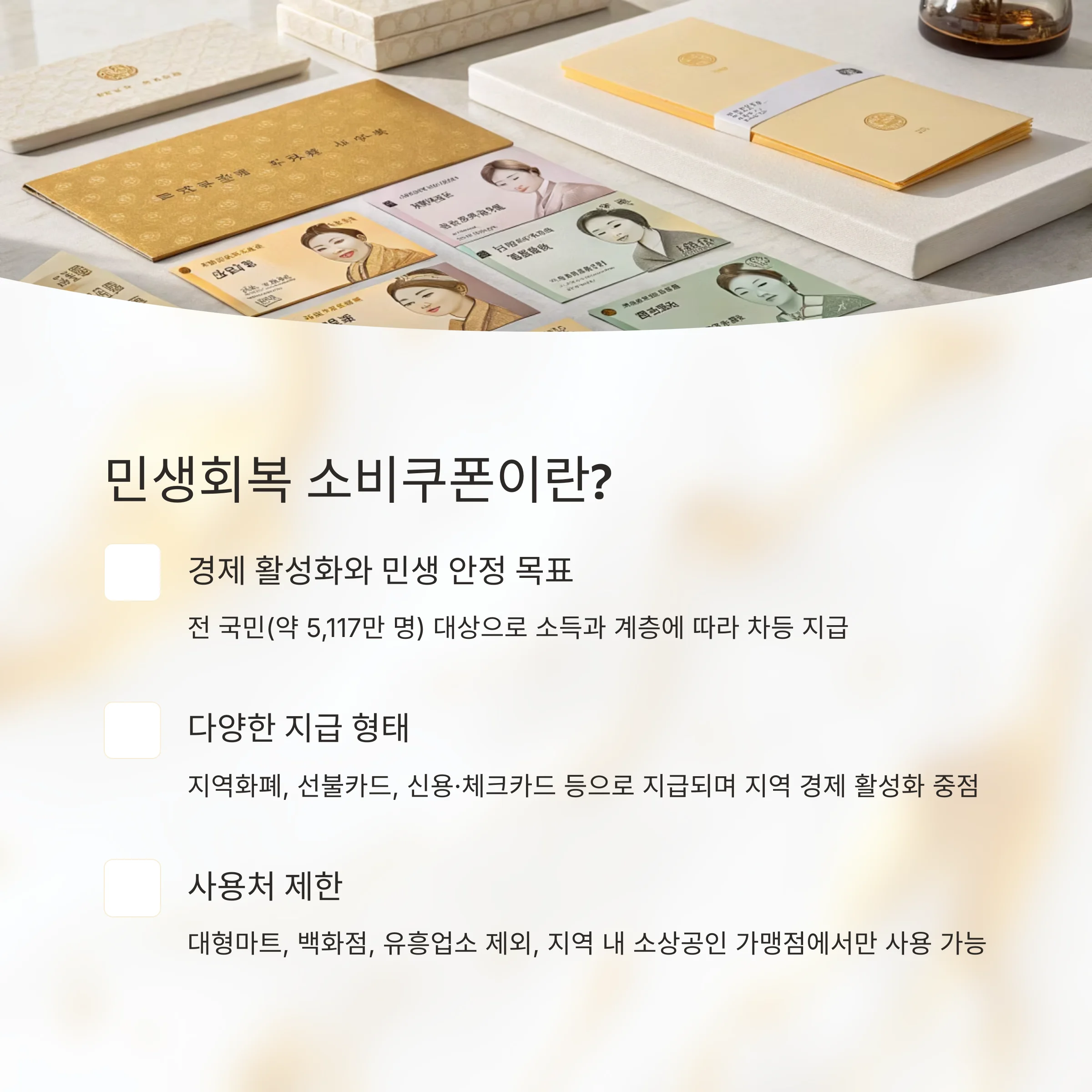 요즘 장을 보러 마트에 가거나 병원에 갈 때마다 물가가 정말 많이 올랐다고 느끼시죠? 그래서 정부가 국민 생활 안정을 위해 ‘민생회복지원금’을 도입했습니다. 그런데 이 지원금, 아무 데서나 사용할 수는 없다는 사실 알고 계셨나요?