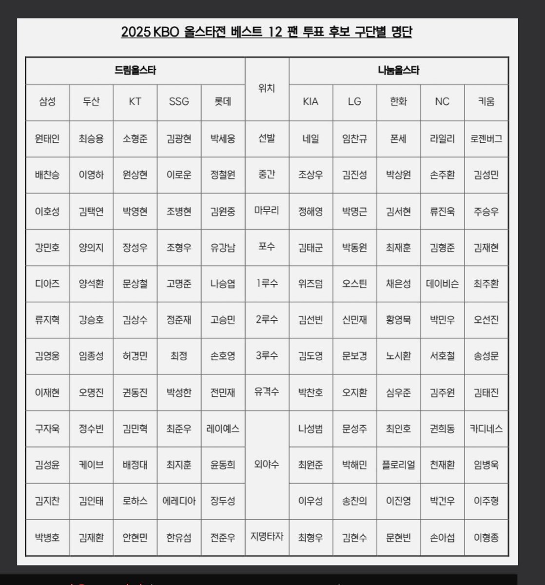 | 올스타 본경기 | 2025년 7월 12일 (토) | 오후 6시 | 대전 한화생명 이글스파크 |